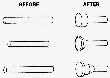 Upsetting (or more properly, upset forging) is a process of increasing the diameter of the end of a work piece, by compressing it along its length inside a die. The images below show the process.